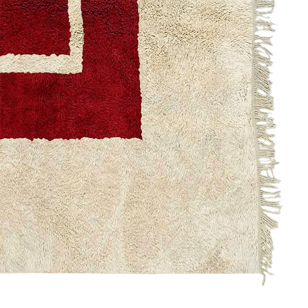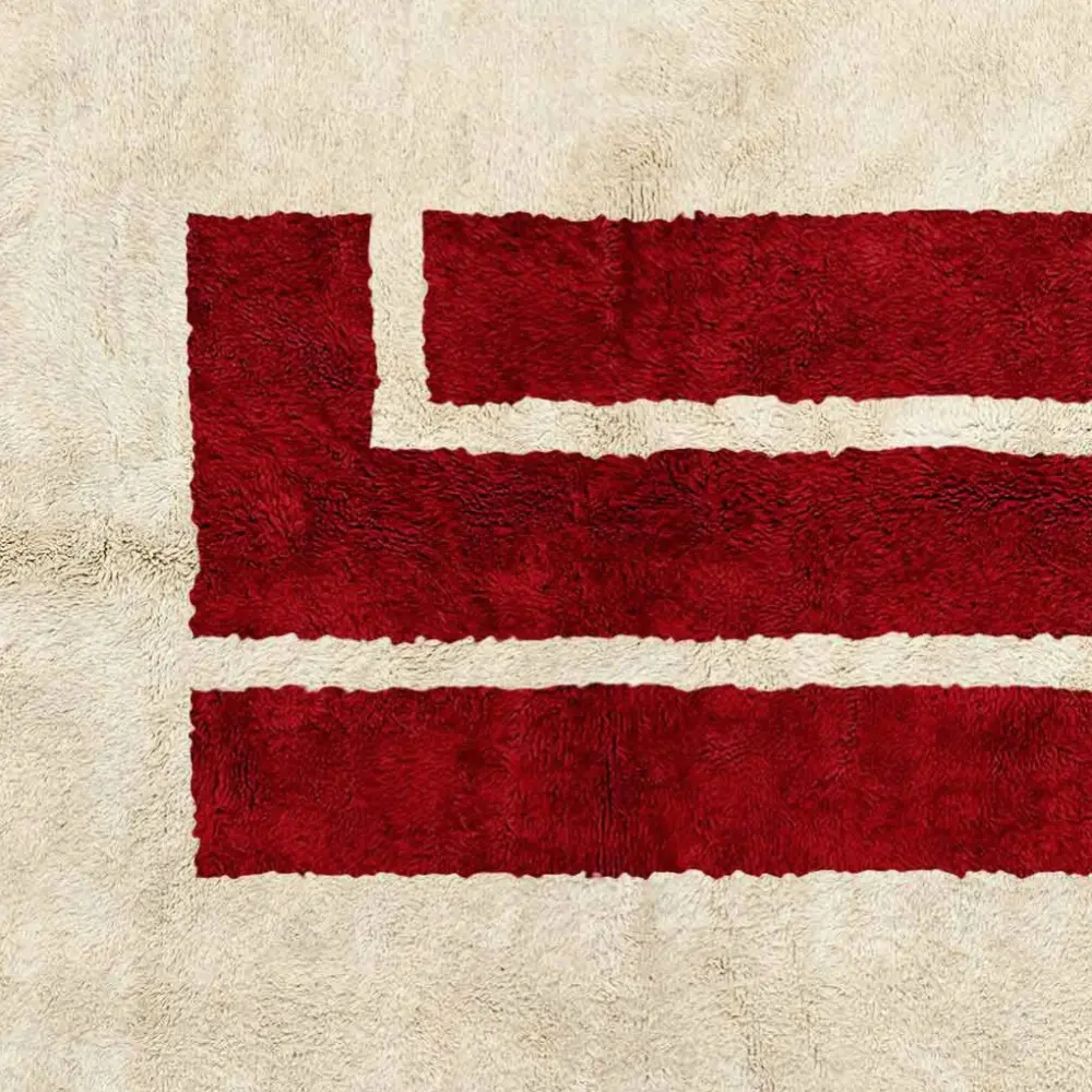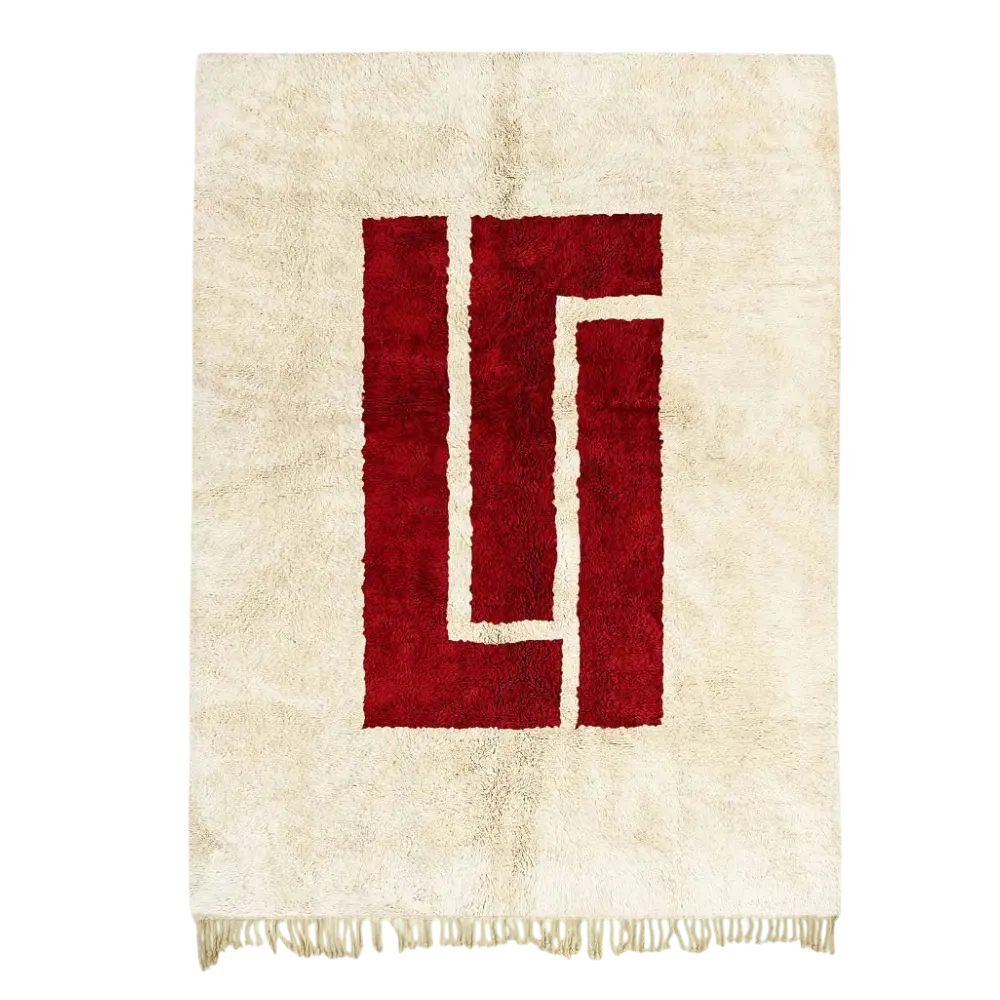 The Atlas Heart Red and Beige Area Rug is a striking piece that combines heritage with modern minimalism. Its cream wool background is highlighted by a bold red geometric motif in the center, giving the rug both balance and impact. This red and beige area rug is designed to be a statement piece in any room, perfect for those who appreciate timeless Moroccan craftsmanship with a contemporary touch.