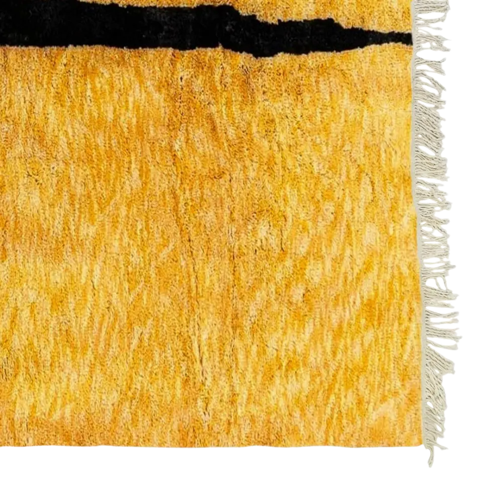 The Chourouk Yellow Black Rug is more than just a floor covering. With its radiant yellow tone, bold black stripe, and authentic handwoven wool, it is a contemporary rug that unites Moroccan tradition with modern design.