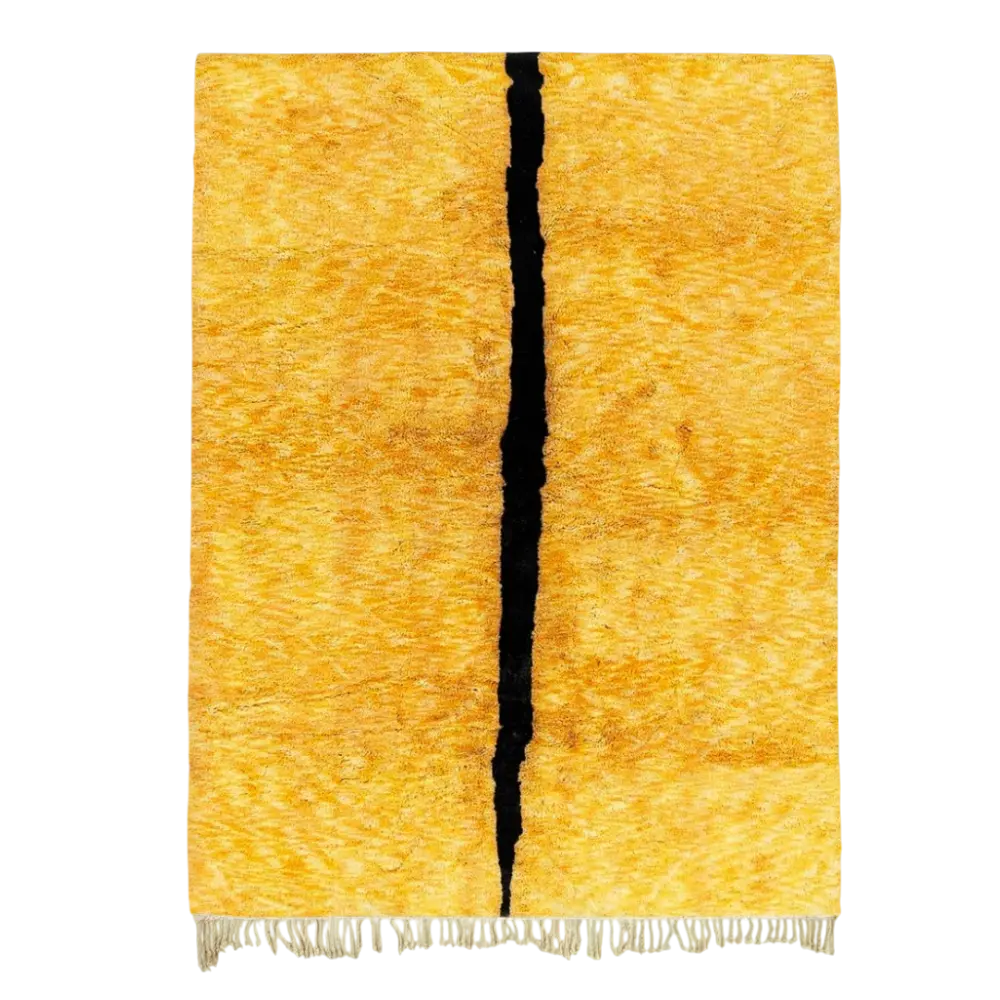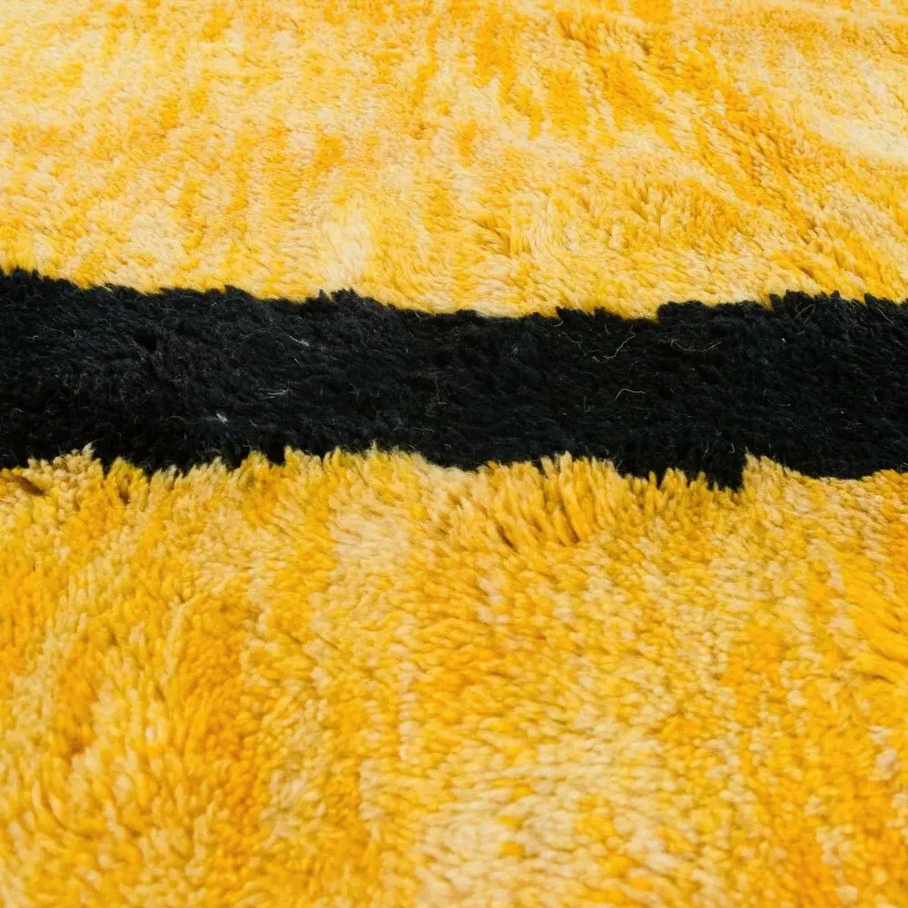 Every Chourouk rug is handwoven in the Atlas Mountains using locally sourced wool. Skilled artisans wash, spin, dye, and weave each rug by hand, ensuring unmatched quality and authenticity. The bold yellow field reflects light and warmth, while the black stripe creates balance and depth. As a Moroccan wool rug, it carries centuries of tradition while embracing a modern design language.