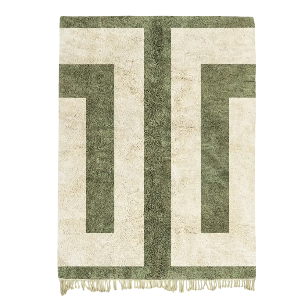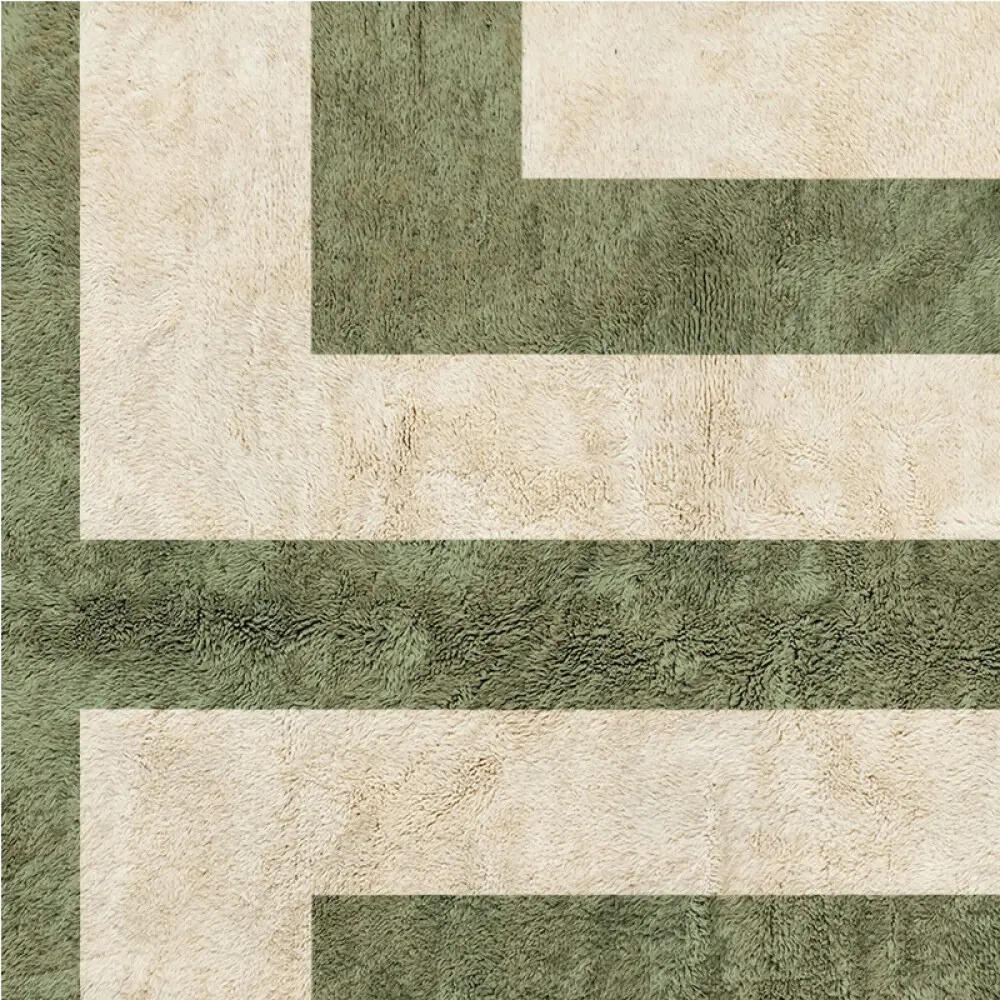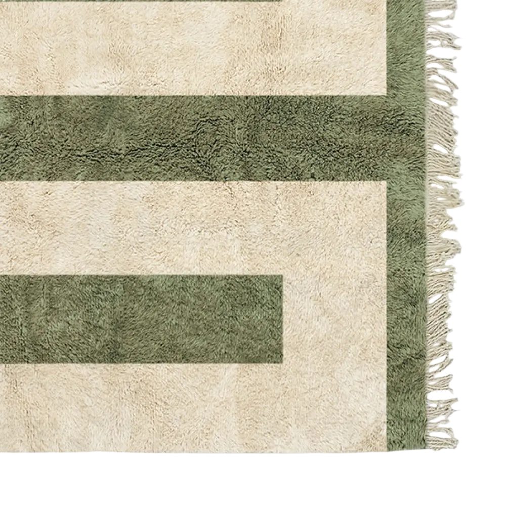 Each Olive Corridor rug is handwoven by skilled artisans in the Atlas Mountains using locally sourced wool. Every step, from washing and spinning to dyeing and weaving, is done by hand, ensuring softness and durability. The olive green tones recall Morocco’s natural landscapes, while the structured design makes this rug a true green Moroccan rug with contemporary appeal.